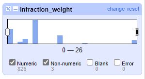 3. Using OpenRefine, I sorted through the data looking for unclean data. The software allows me to sort by ‘data types’ and while I would expect numeric data in the ‘infraction_weight’ column I can see there are outliers of an inconsistent data type; string and text.